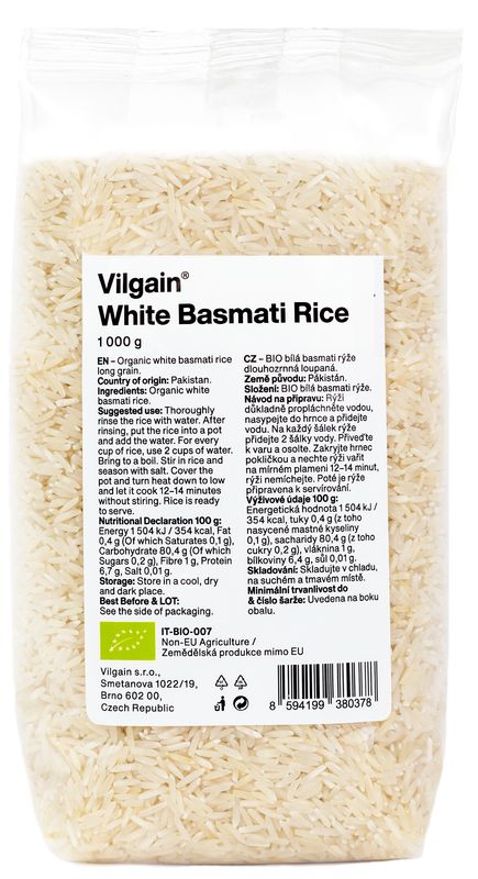 Vilgain White Basmati Rice BIO je dlouhozrnná loupaná rýže z ekologického zemědělství. Během vaření zůstává pevná, sypká a nelepí se.