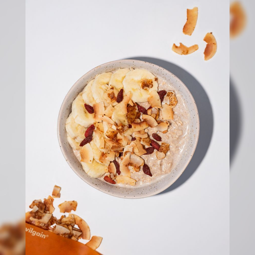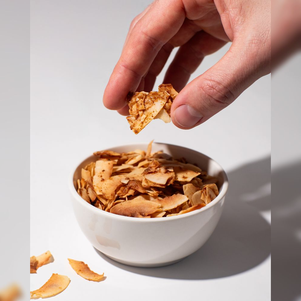 Pečený kokos se skvělou chutí a čistým složením. Obsahují vlákninu a minerální látky. Navíc se mohou pochlubit nízkým glykemickým indexem, takže snadno zasytí a nebude tě po nich honit mlsná.