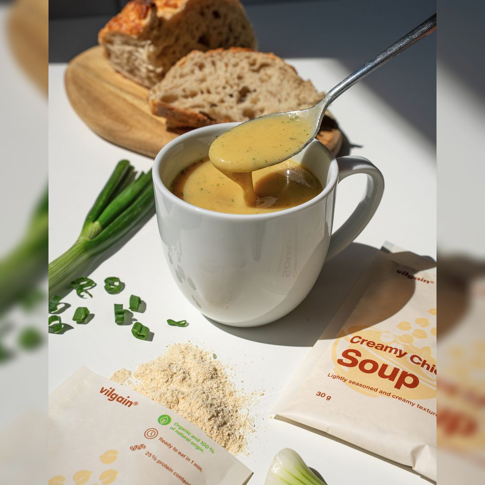 instantní polévka do hrnku, zdroj rostlinných bílkovin, hotová za 1 minutu, bez glutamátu