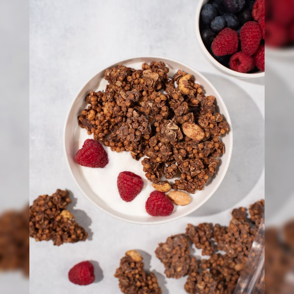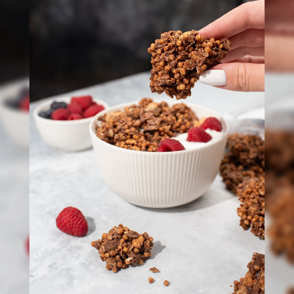 vločky a ořechy zapečené do velkých křupavých clusterů, obohacené o mléčné proteinové křupinky, jednoduchá svačinka i základ pro výživnou snídani