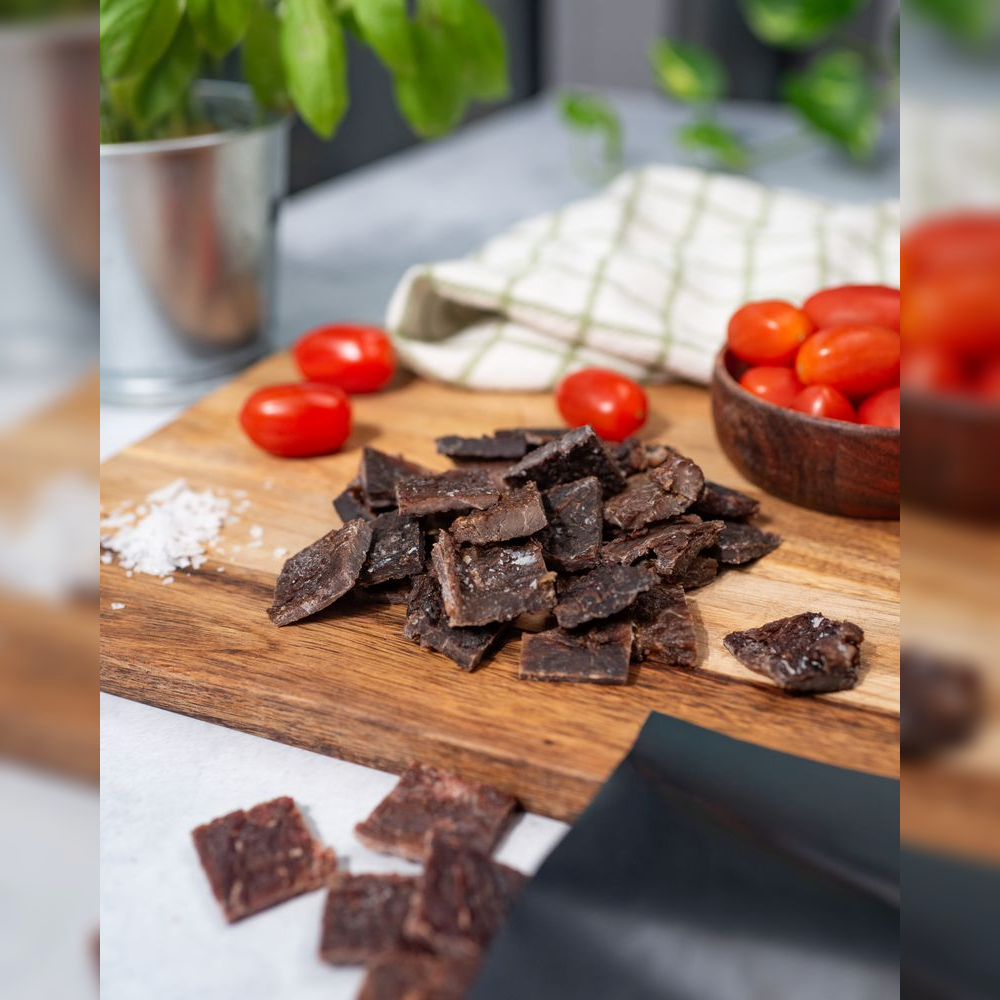 křehké sušené maso z trávou krmených mladých kusů skotu, prémiová plemena z estonských luk, 99% obsah masa