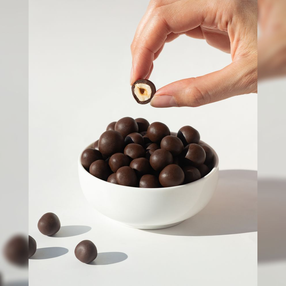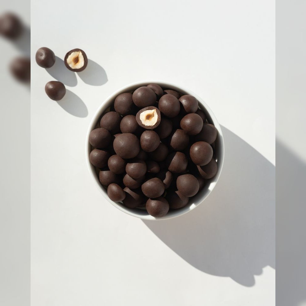 ručně sbírané ořechy zalité vrstvou čokolády, bez leštících látek, vyráběno v malých šaržích pro maximální čerstvost