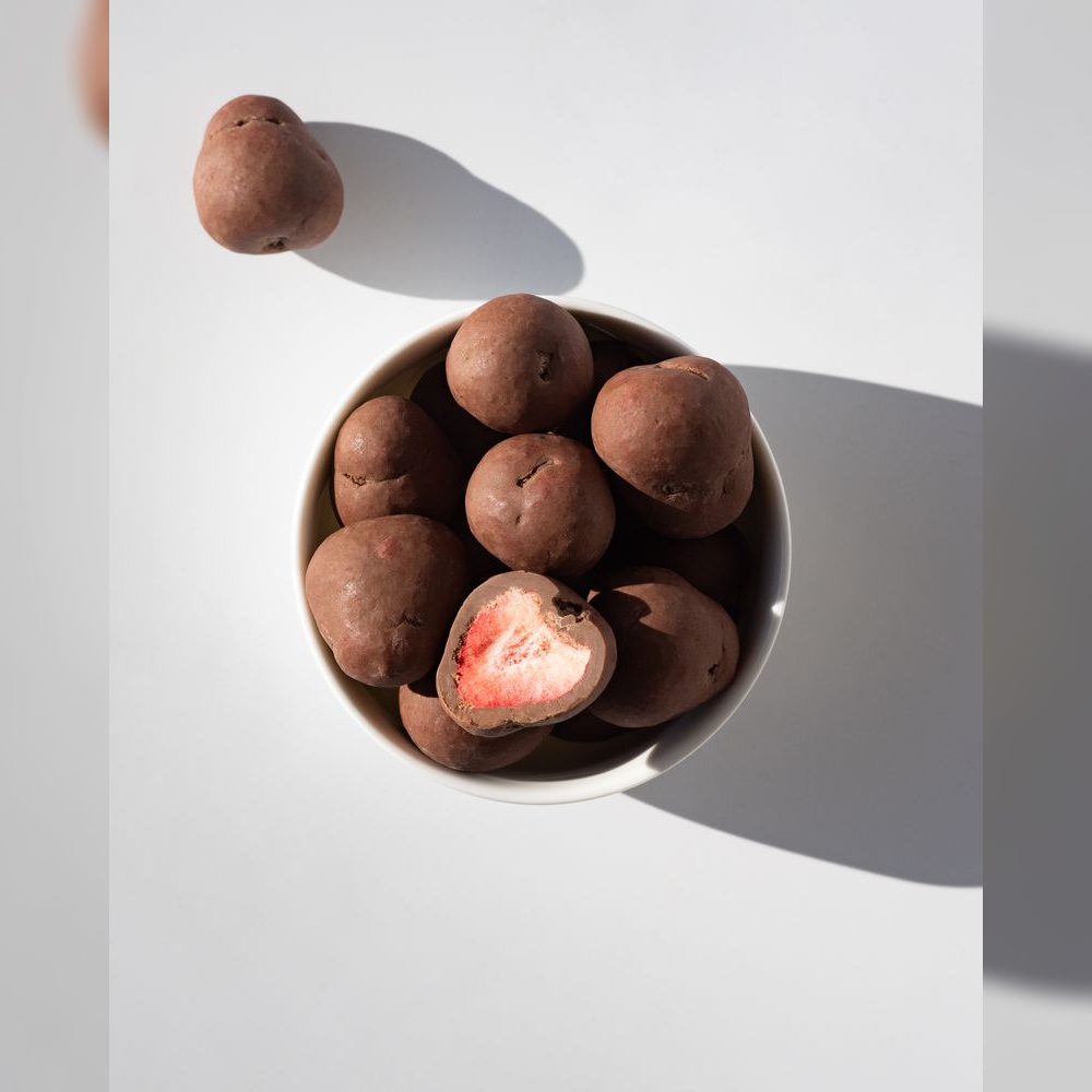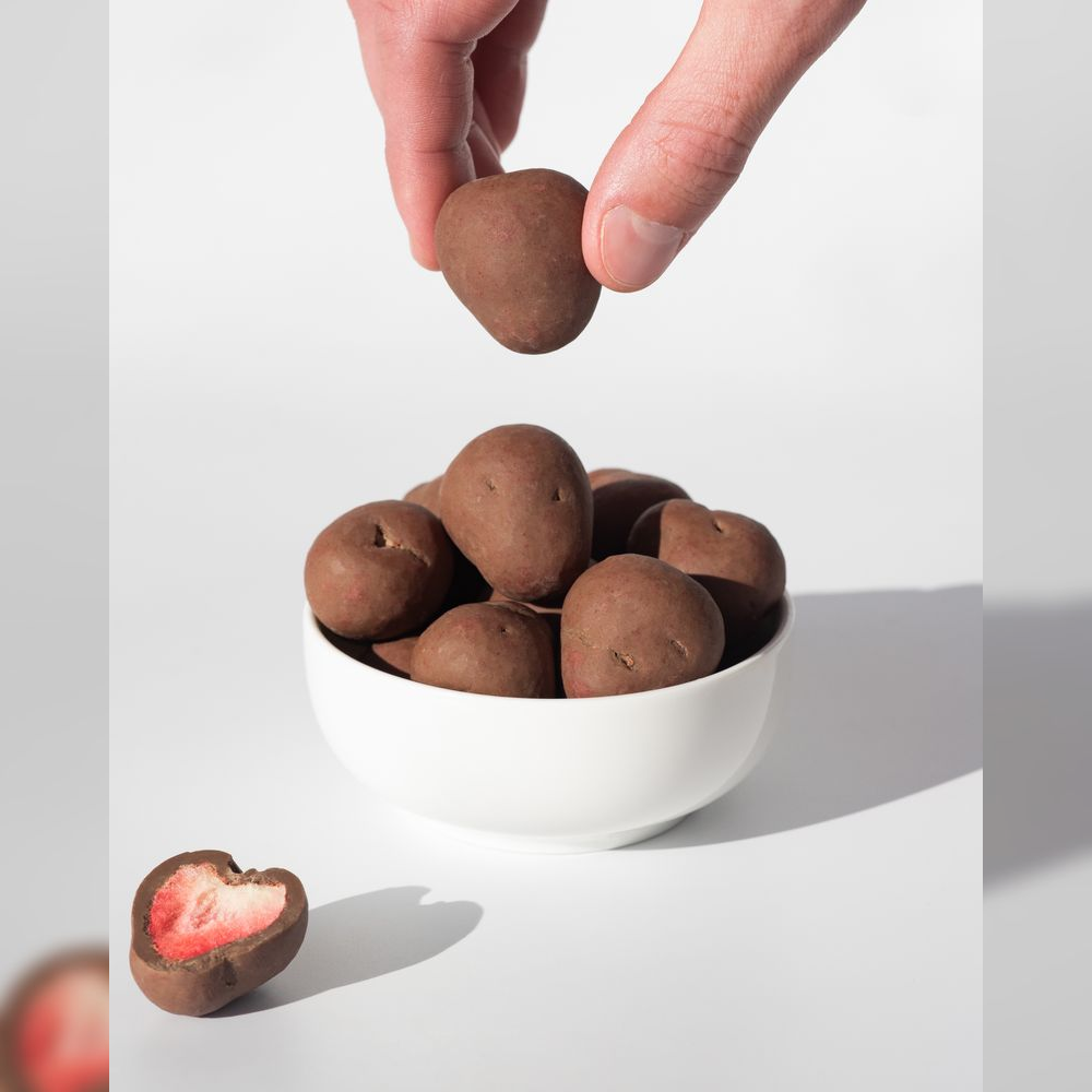 křupavé jahody sušené mrazem, zalité čokoládou s vysokým obsahem kakaa, bez lecitinů a leštících látek